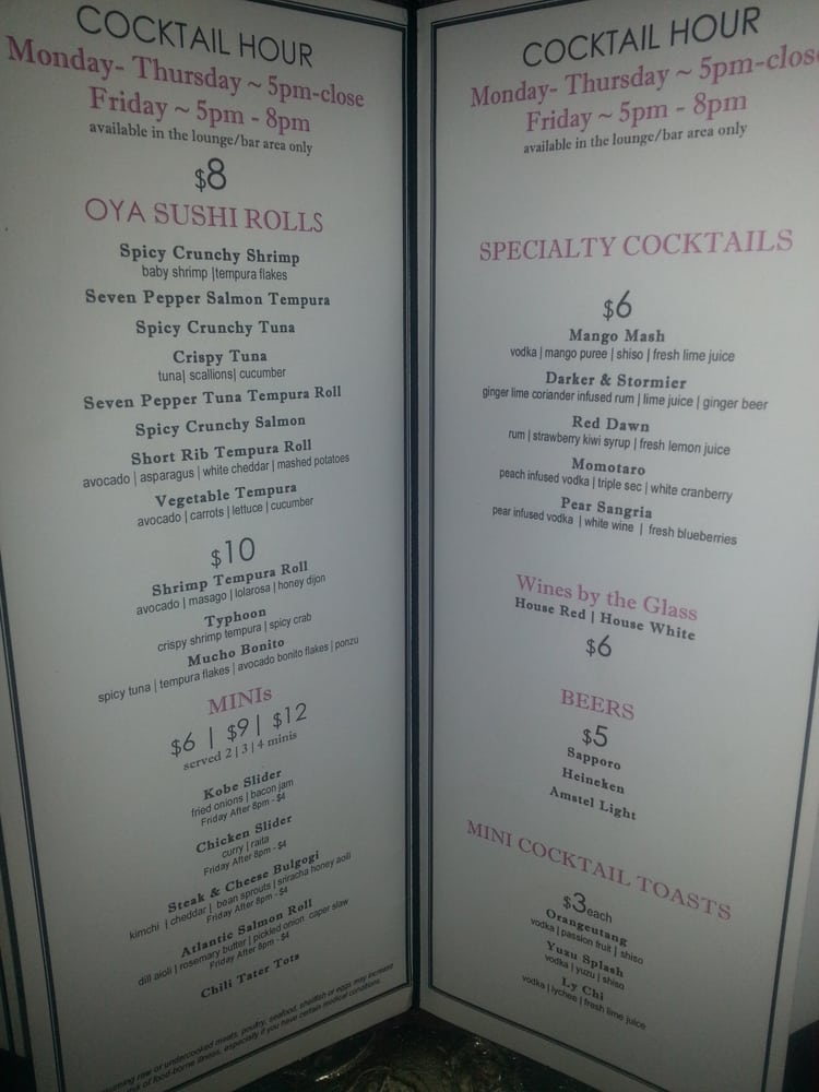 OYA is a trendy Asian fusion lounge located in Washington, DC, offering an array of amenities including valet parking, outdoor seating, and a full bar. Customers have praised the attentive service, eclectic wine list, and diverse menu options. Standout dishes include the salmon tempura, short rib egg rolls, and Typhoon sushi roll. The ambiance is described as attractive and the cocktails are delicious, making it an ideal spot for gatherings or date nights. The décor features a striking white and fire motif, creating a classy and professional atmosphere. With a range of options for sushi lovers and non-sushi eaters alike, OYA has something for everyone. Whether you're in the mood for seafood, burgers, or cocktails, OYA promises a memorable dining experience.